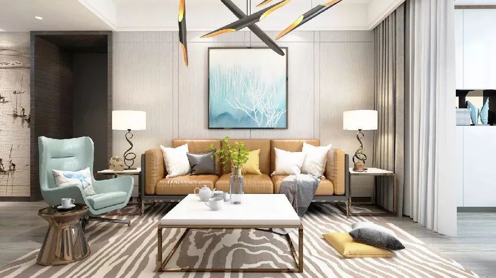装饰画有蓝色抱枕采用同样的蓝色;装饰画有橙色,抱枕和茶几也利用橙色保持一致;地毯呢则可以和装饰一致了。